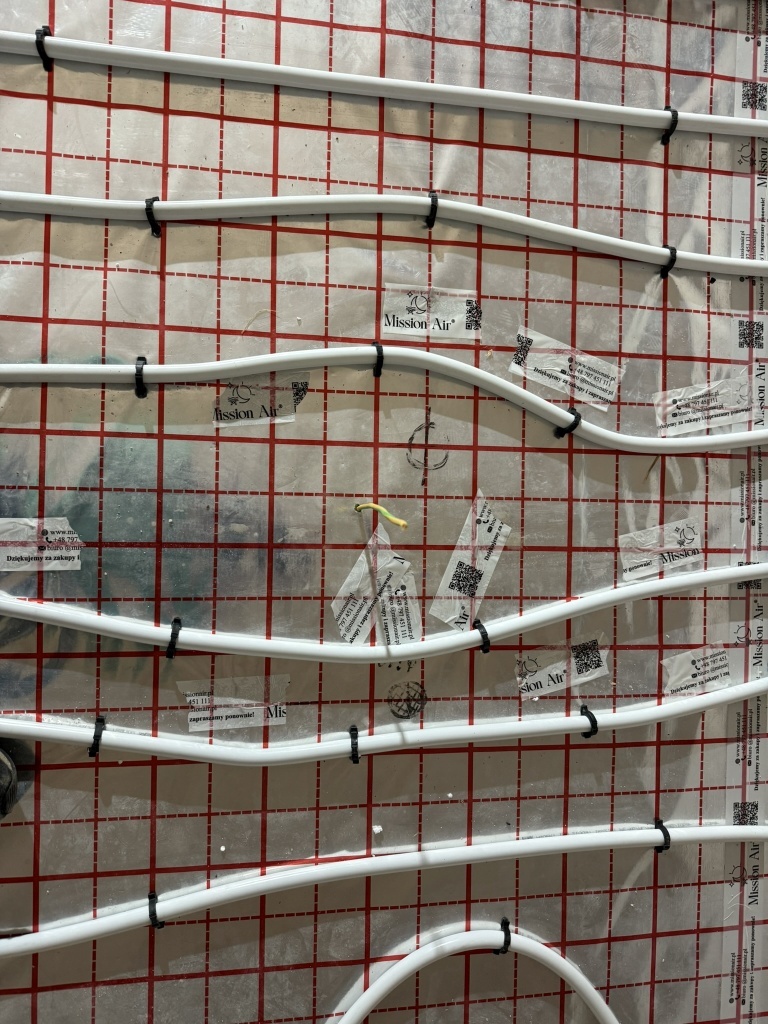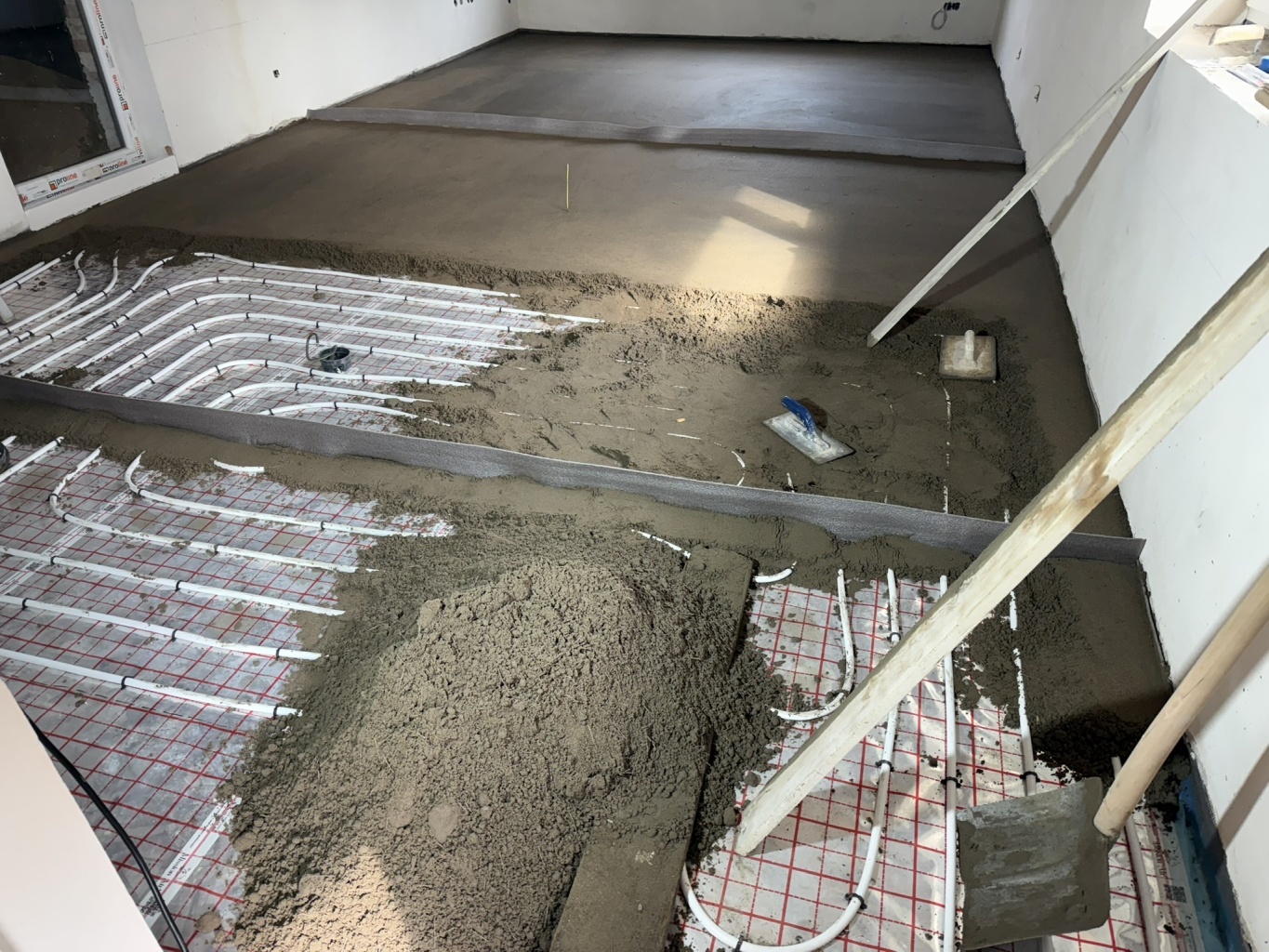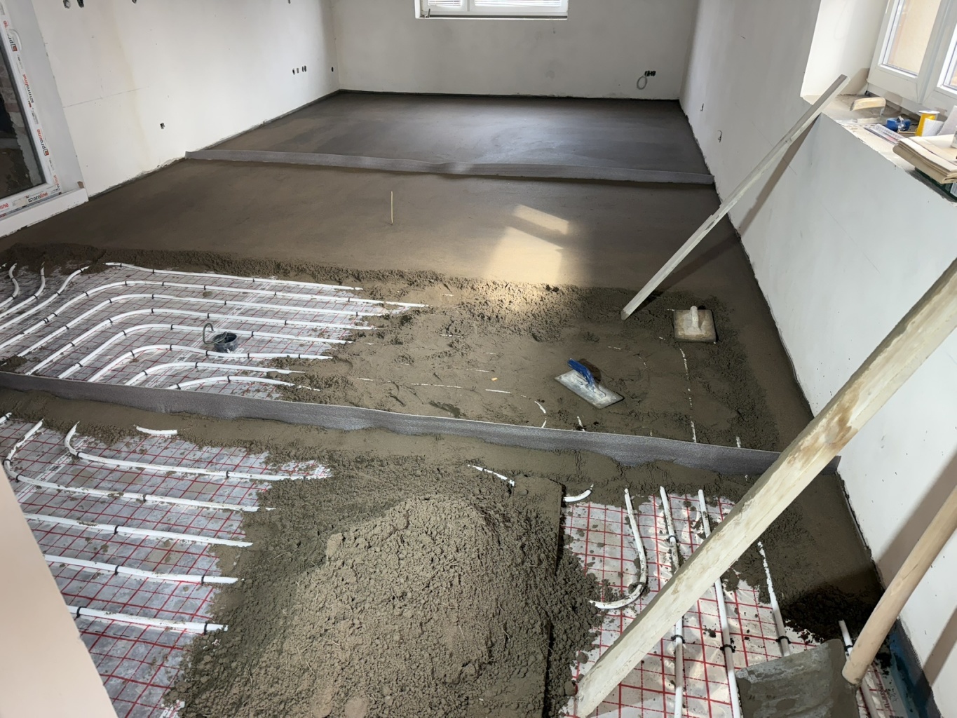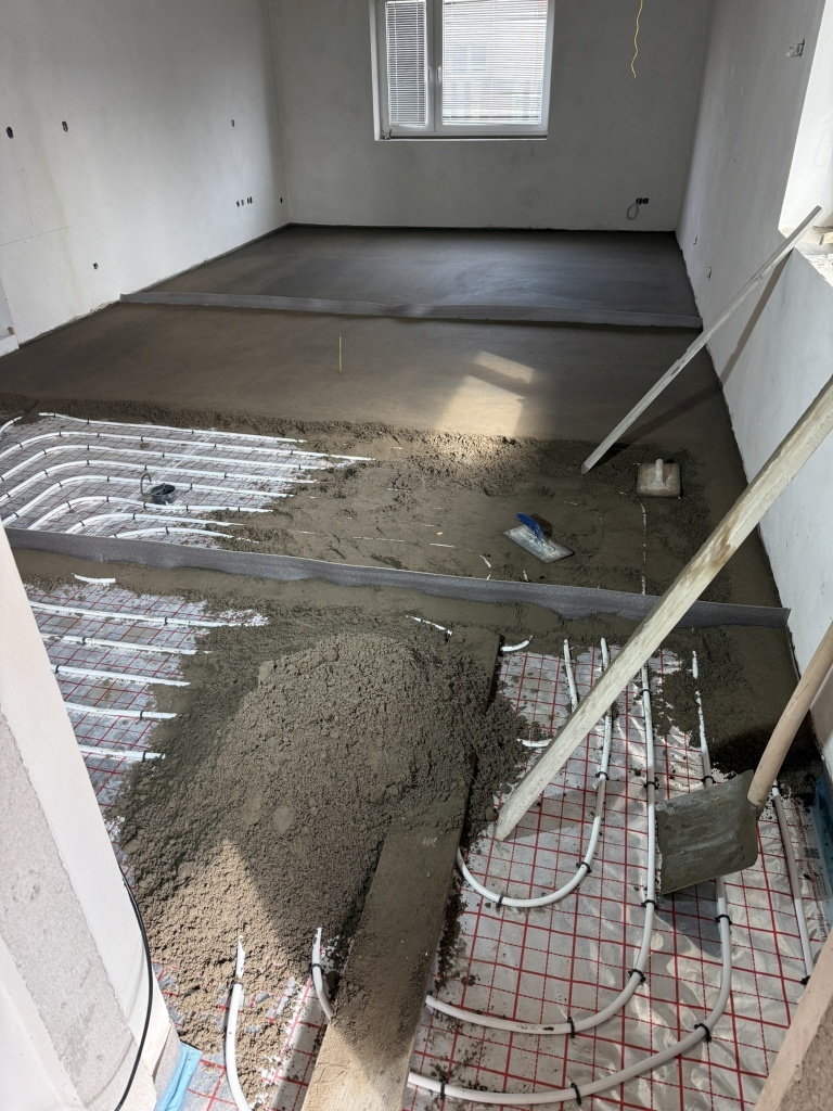 Čekal jsem, až bude konečně nějakou dobu tepleji, kolem 5°C a výš, abych se mohl pustit do betonování podlahy v přízemí. Tak jako všude, podlahové topení a na to betonový potěr s vláknama a hlavně s plastifikátorem. Vlákna proto, že jsem nechtěl kari síť – moje volba 🙂